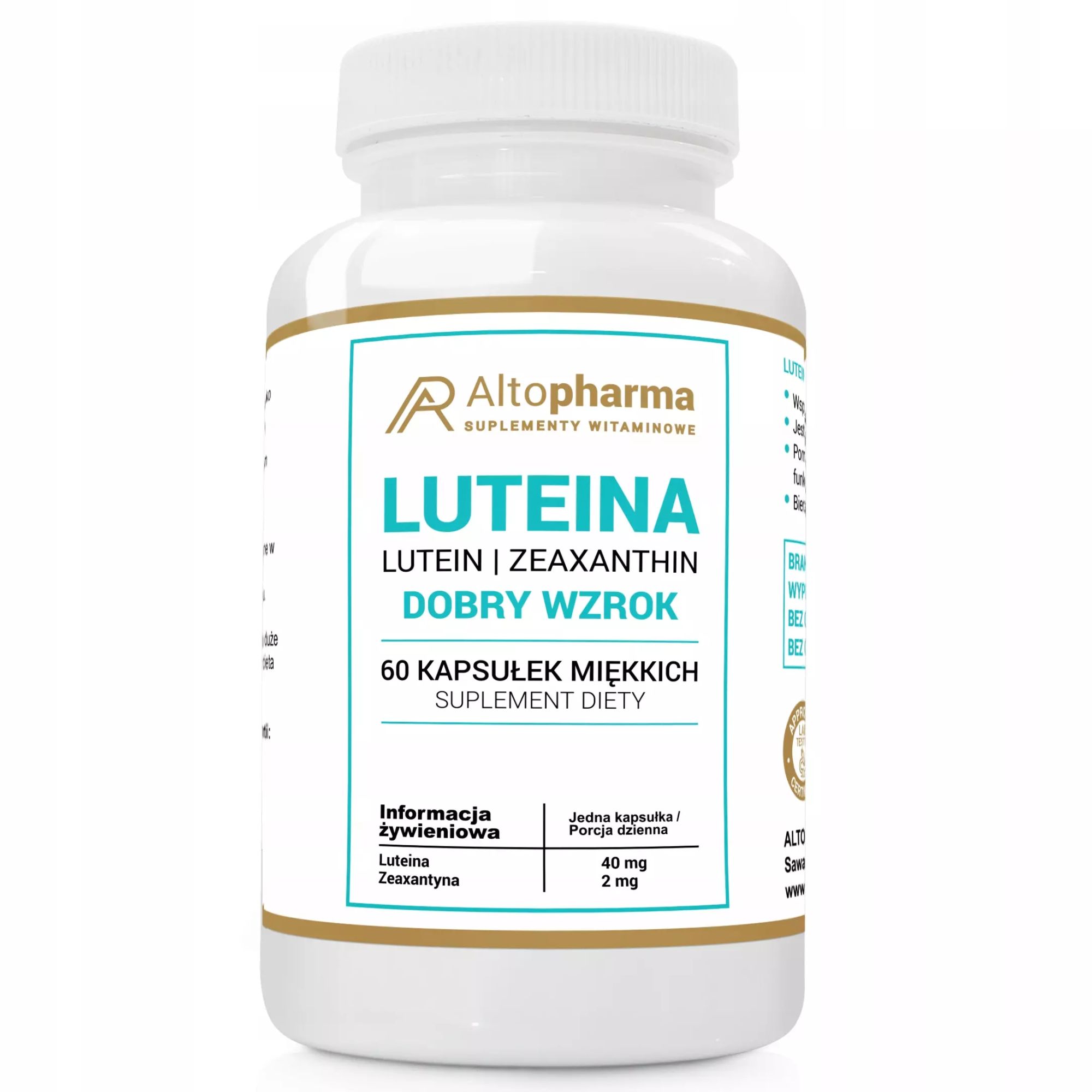 Alto Pharma Luteina Complex to suplement diety dedykowany dbałości o Twoje oczy. Dzięki formule najbardziej przyswajalnej przez organizm, zapewnia 40mg luteiny i 2mg zeaksantyny w każdej porcji. Nowoczesna receptura tego preparatu wyróżnia się spośród innych produktów, gwarantując najwyższą jakość składników. Kapsułki miękkie marki Altopharma to gwarancja najlepszej przyswajalności, dzięki wyjątkowemu olejowi z krokosza barwierskiego i olejowi z nasion soi.