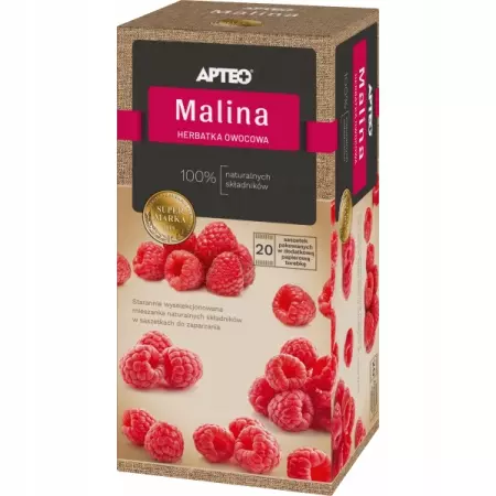 Herbatka Malina Apteo Natura zawiera 50% owoców maliny będących źródłem wyjątkowego smaku i aromatu.