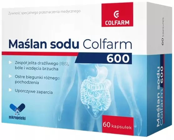 Maślan sodu Colfarm to żywność specjalnego przeznaczenia medycznego dla dorosłych. Zawiera maślan sodu w postaci mikropeletek o przedłużonym uwalnianiu, zamkniętych w celulozowych kapsułkach odpornych na działanie kwasów żołądkowych. Zawarty w kapsułkach kwas masłowy jest krótkołańcuchowym kwasem tłuszczowym, który jest materiałem energetycznym dla nabłonka jelitowego i wykazuje korzystne działanie na układ pokarmowy.