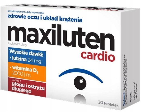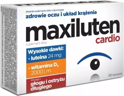 Maxiluten cardio zawiera wysoką dawkę luteiny jak również zeaksantynę oraz witaminy i minerały (beta-karoten jako źródło witaminy A i cynk) mogące korzystnie wpływać na wzrok. Maxiluten przeznaczony jest dla osób, które chcą wspierać ochronę zdrowia oczu oraz dla osób narażonych na działanie czynników mogących prowadzić do osłabienia wzroku. Dodatkowo za sprawą wyciągu z głogu i ostryżu wspomaga prawidłowe funkcjonowanie serca i układu krążenia.