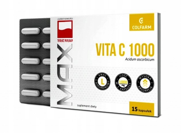 MAX VITA C 1000 to wysokiej jakości suplement diety zawierający 1000 mg (1250% RWS*) witaminy C (kwasu L-askorbinowego) w 1 kapsułce. Witamina C wspiera układ nerwowy i odpornościowy, prawidłowy przebieg procesów metabolicznych oraz proces produkcji kolagenu. Uczestniczy w prawidłowym przebiegu funkcji psychologicznych oraz przyczynia się do zmniejszenia uczucia znużenia i zmęczenia.