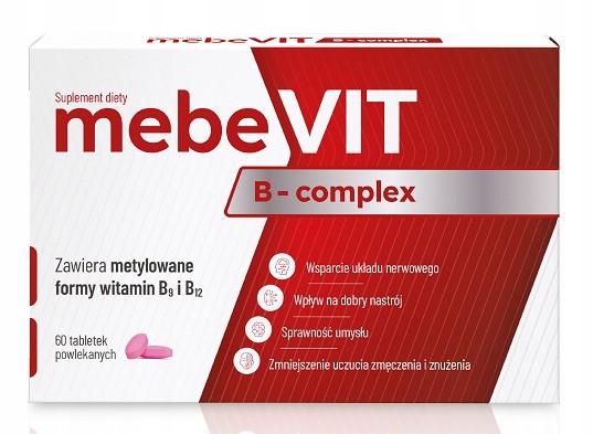 Mebevit B-Complex to suplement diety, który zawiera kompleks witamin z grupy B o udowodnionym działaniu, w tym metylowane formy witaminy B9 czyli kwasu foliowego oraz witaminy B12 (metylokobalamina).