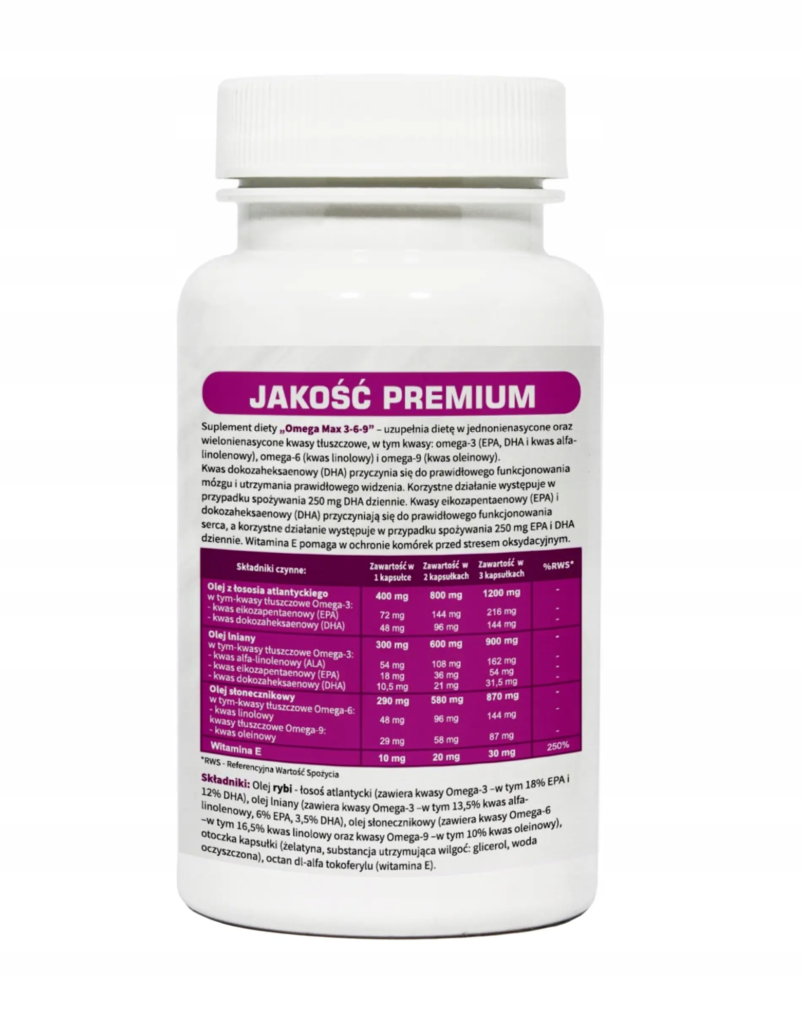 - ✅Uzupełnia dietę w jednonienasycone oraz wielonienasycone kwasy tłuszczowe, w tym kwasy: omega-3 (EPA, DHA i kwas alfa-linolenowy), omega-6 (kwas linolowy) i omega-9 (kwas oleinowy).