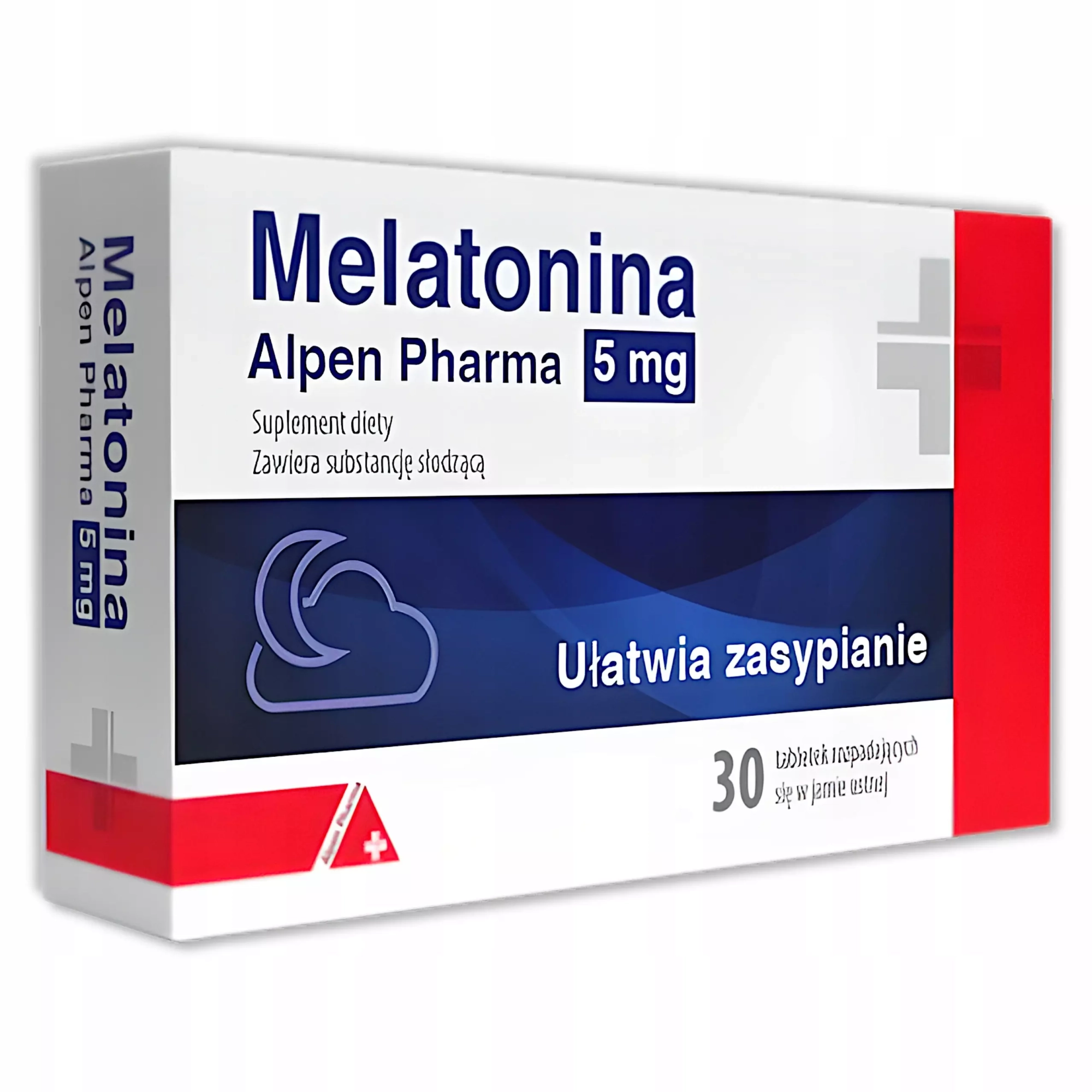 • Melatonina 5 mg Alpen Pharma – suplement diety z melatoniną w postaci tabletek rozpadających się w jamie ustnej. Produkt przeznaczony dla osób dorosłych.
