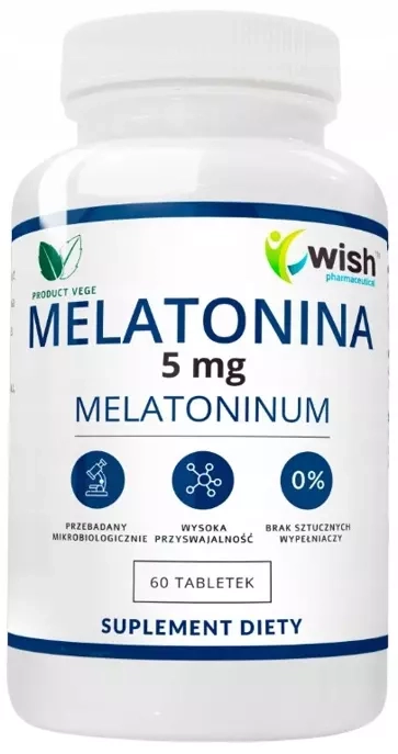 Melatonina 5mg Wish 60 tabletek Suplement diety Zalety: ✅ Melatonina pomaga w skróceniu czasu potrzebnego na zaśnięcie,