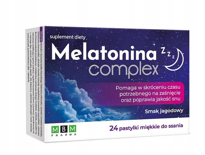 Opis preparatu – właściwości: Melatonina Complex to suplement diety w postaci pastylek miękkich do ssania. Zawiera w swoim składzie ekstrakt z korzenia kozłka lekarskiego, ekstrakt z kwiatów rumianku, ekstrakt z kwiatu lawendy wąskolistnej, witaminę B6 oraz melatoninę. Witamina B6 pomaga w prawidłowym funkcjonowaniu układu nerwowego. Kozłek lekarski pomaga w utrzymaniu prawidłowej jakości snu. Rumianek przyczynia się do optymalnego relaksu. Ekstrakt z kwiatów lawendy działa uspokajająco. Melatonia pomaga w skróceniu czasu potrzebnego do zaśnięcia.