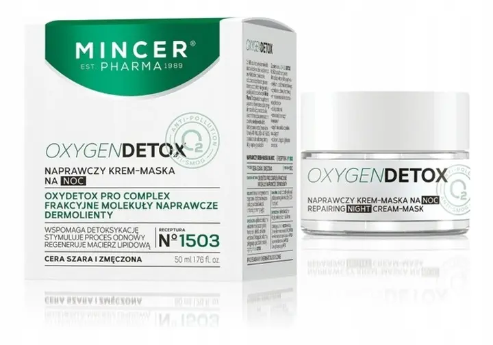 Krem - maska naprawczy na noc z linii Oxygen Detox, którego zadaniem jest wpływ na zwiększenie oddychania komórkowego, minimalizowanie skutków działania wolnych rodników. Receptura zawiera takie składniki jak: oxydetox pro complex, frakcyjne molekuły naprawcze oraz dermolienty wspomagające detoksykacje, stymulują proces odnowy, a także regenerują macierz lipidową.Rezultat: Proces detoksykacji i odnowy skóry, stymulowaniu odnowy komórkowej, minimalizowaniu skutków działania wolnych rodników. Wspomaga detoksykację, stymuluje proces odnowy, regeneruje macierz lipidową.Sposób użycia:Aplikować codziennie wieczorem na uprzednio oczyszczoną skórę twarzy, szyi i dekoltu. Producent: Mincer Pharma Linia: Oxygen Detox Działanie: regeneruje Konsystencja: krem, maska Pora stosowania: noc Płeć: damski Typ skóry: mieszana/tłusta, normalna, sucha Pojemność: 50 ml