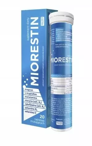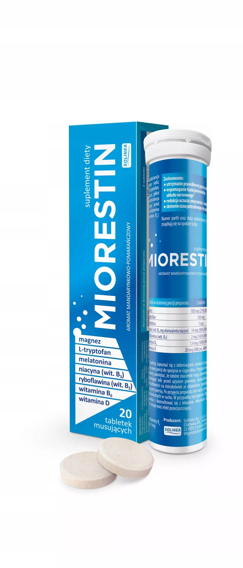 MIORESTIN Tabletki musujące o smaku mandarynkowo - pomarańczowym to preparat uzupełniający codzienną dietę w magnez, L-tryptofan, melatoninę, niacynę (wit. B3), ryboflawinę (wit. B2) oraz witaminę B6 i D. Dzięki kompleksowemu składowi preparat wspiera utrzymanie prawidłowej pracy mięśni i funkcjonowanie układu nerwowego, pomaga w redukcji poczucia zmęczenia i znużenia, a także skraca czas potrzebny na zaśnięcie.