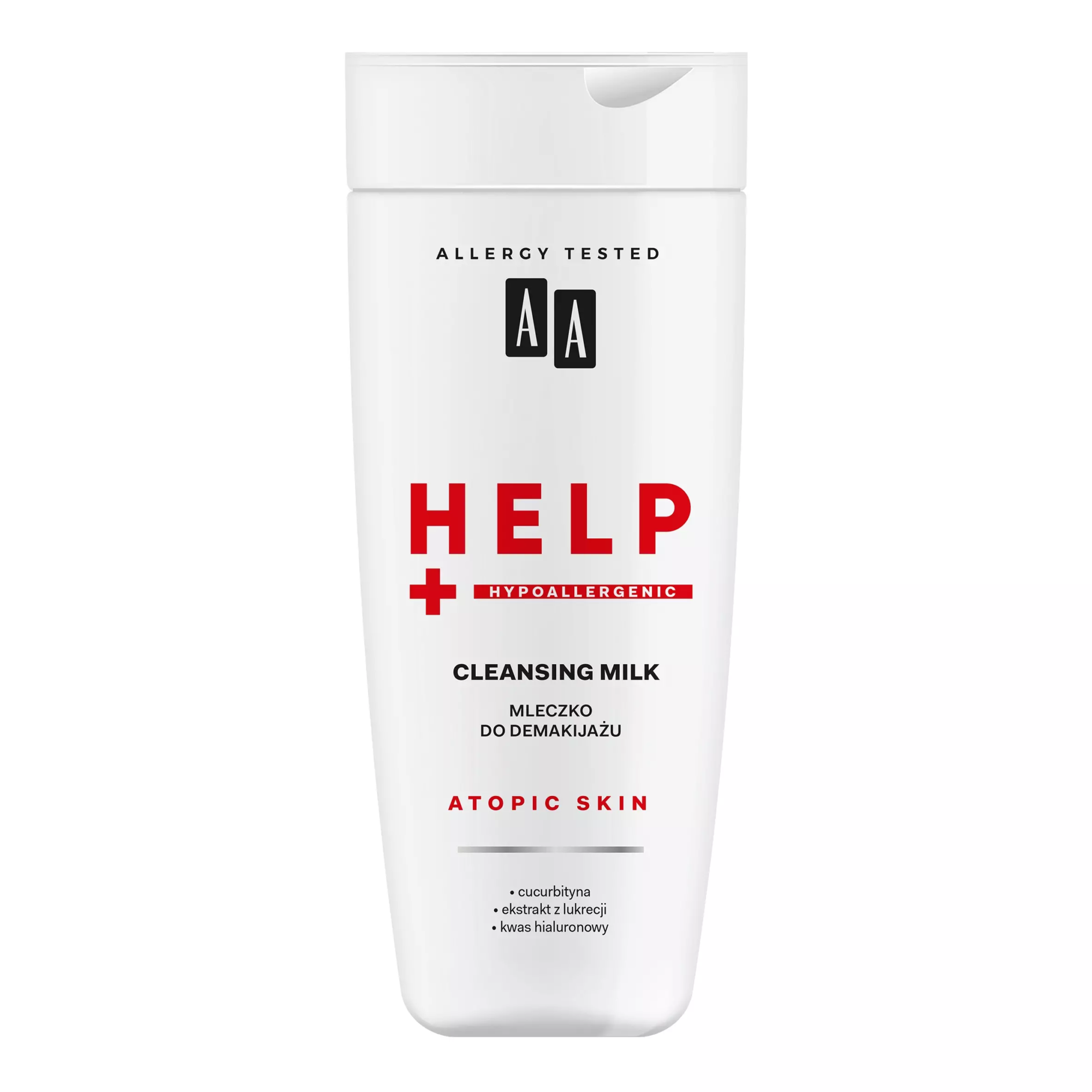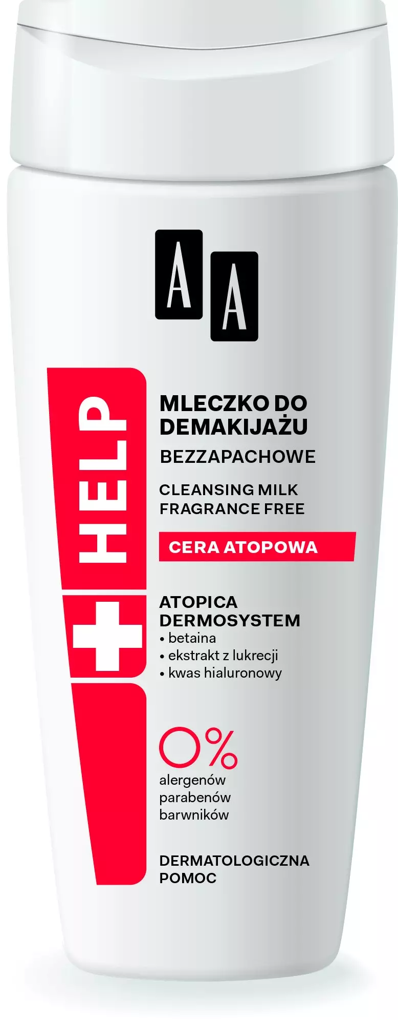 HELP+ - Cleansing Milk marki AA. Mleczko do demakijażu. Stworzone z myślą o pielęgnacji skóry nadwrażliwej, skłonnej do podrażnień, podatnej na przesuszenie i źle tolerującej konwencjonalne kosmetyki. Dokładnie usuwa makijaż i oczyszcza skórę z wszelkiego rodzaju zanieczyszczeń. Delikatna, bezzapachowa formuła wolna od barwników wykazuje właściwości kojące, łagodzące podrażnienia oraz nawilżające. Kosmetyk wzbogacony został o kukurbitynę, alantoinę, ekstrakt z lukrecji, glicerynę i kwas hialuronowy. Mleczko umieszczono w butelce o pojemności 200 ml.