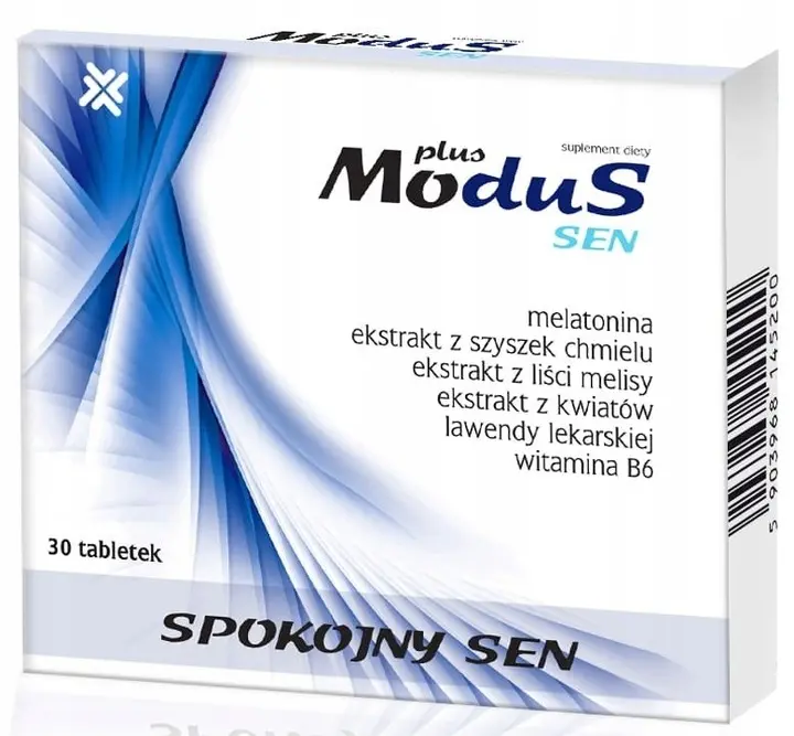 Modus Sen Plus to suplement diety stworzony ze starannie skomponowanych witamin i składników roślinnych z myślą o osobach zestresowanych i poddenerwowanych, borykających się z problemem z zasypianiem. Składniki aktywne: Melatonina - to pochodna tryptofanu. Jej produkcja w naturalnych warunkach odbywa się głównie w szyszynce. Spożycie 1 mg melatoniny na krótko przed pójściem spać może przyczyniać się do skrócenia czasu, jaki jest potrzeby do zaśnięcia. Co więcej, melatonina pomaga także w łagodzeniu subiektywnego odczucia zespołu nagłej zmiany strefy czasowej (aby uzyskać korzystne działanie, należy spożywać 0,5 mg melatoniny krótko przed pójściem spać pierwszego dnia podróży i przez kolejne kilka dni po przybyciu do celu podróży). Witamina B6 - wspiera prawidłową pracę układu nerwowego oraz przyczynia się do zmniejszenia uczucia zmęczenia i znużenia. Jednocześnie pomaga w utrzymaniu prawidłowego metabolizmu energetycznego oraz w utrzymaniu prawidłowych funkcji psychologicznych. Melisa lekarska - w naturalny sposób wspiera zdrowy sen. Pomaga się zrelaksować i wspiera dobre samopoczucie psychiczne. Chmiel zwyczajny - działa uspokajająco na układ nerwowy i wspiera zdrowy sen. Lawenda - działa relaksująco i poprawia jakość snu. Stosowanie: Dorośli - 1 tabletka dziennie. Tabletkę należy przyjmować przed snem. 1 tabletka zawiera: Suchy ekstrakt z szyszek chmielu (Humulus lupulus) - 180 mg (720 mg)** Suchy ekstrakt z liści melisy (Melissa officinalis) - 80 mg (800 mg)** Suchy ekstrakt z kwiatów lawendy lekarskiej (Lavandula officinalis) - 25 mg (100 mg)** Witamina B6 (chlorowodorek pirydoksyny) - 1,4 mg (100%)* Melatonina - 1 mg *RWS - Referencyjna Wartość Spożycia **ilość surowca roślinnego Skład: Suchy ekstrakt z szyszek chmielu (Humulus lupulus), suchy ekstrakt z liści melisy (Melissa officinalis), substancja wypełniająca (celuloza mikrokrystaliczna) suchy ekstrakt z kwiatów lawendy lekarskiej (Lavandula officinalis), skrobia ziemniaczana, witamina B6 (chlorowodorek pirydoksyny), substancja przeciwzbrylająca (sole magnezowe kwasu tłuszczowego - stearynian magnezu), substancja utrzymująca wilgoć (dwutlenek krzemu), melatonina. Ważne: Nie należy przekraczać zalecanej dziennej porcji. Nie stosować jednocześnie z alkoholem i innymi preparatami (w tym także roślinnymi). Zrównoważony sposób żywienia i prawidłowy tryb życia jest ważny dla funkcjonowania organizmu człowieka. Suplementy diety nie mogą być stosowane jako substytut (zamiennik) zróżnicowanej diety. Suplement diety powinien być przechowywany w sposób niedostępny dla małych dzieci. Przechowywać w suchym miejscu, w temperaturze pokojowej. Chronić przed działaniem promieni słonecznych. Zawartość netto: 13,5 g Producent: Pharmacy Laboratories, ul. Wisełki 57, Warszawa.