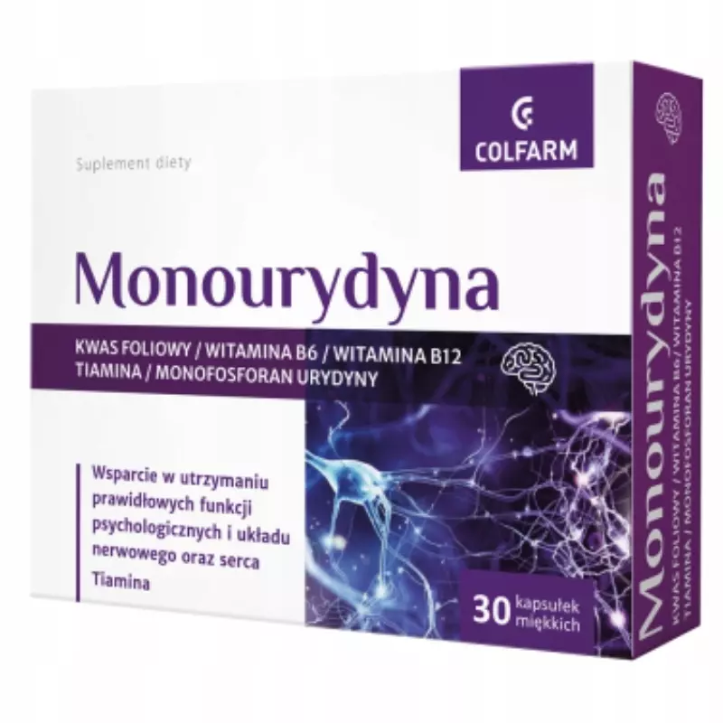 Suplement diety Monourydyna zawiera kwas foliowy, witaminę B6, B12, tiaminę oraz monofosforan urydyny.