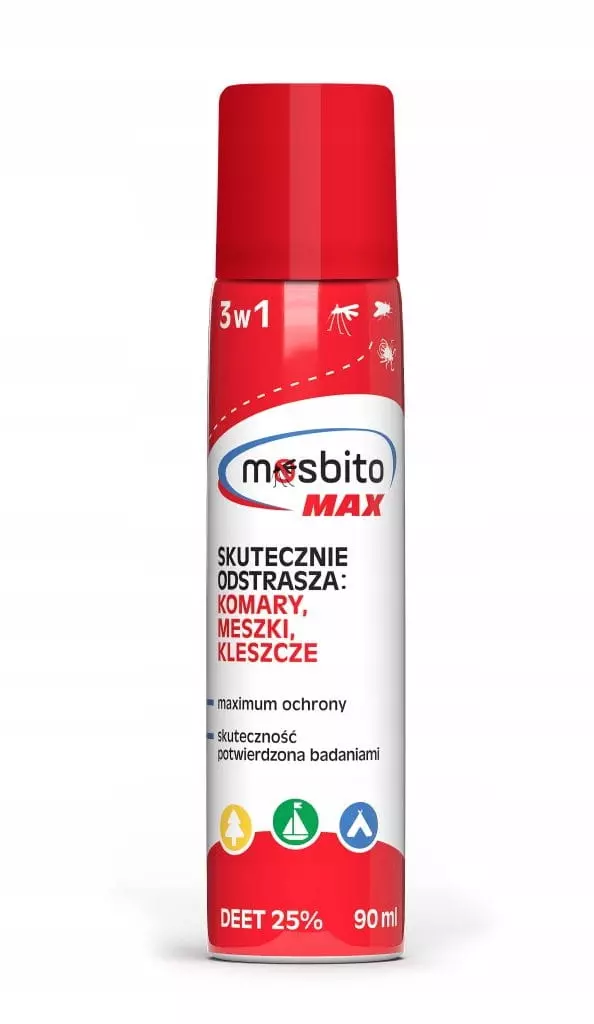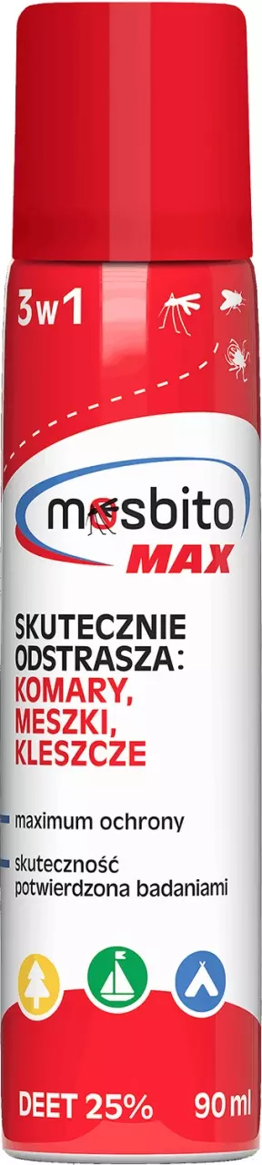 Mosbito Max to spray odstraszający komary, kleszcze i meszki z DEET 25%. Wygodny w użyciu spray 3 w 1 na komary, kleszcze i meszki przeznaczony jest dla dzieci powyżej 12. roku życia i dorosłych.