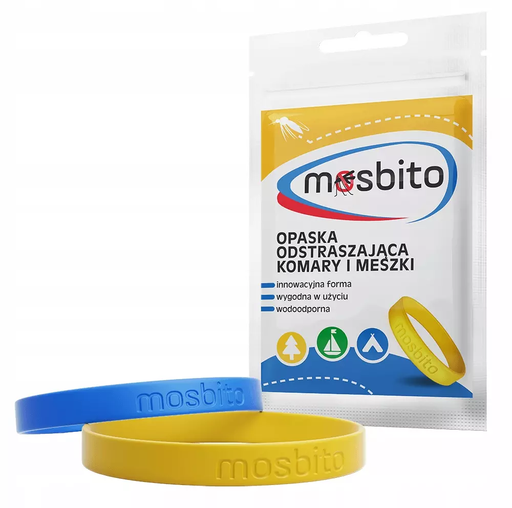 Silikonowa opaska na nadgarstek nasączona geraniolem, którego zapach skutecznie odstrasza komary i meszki.