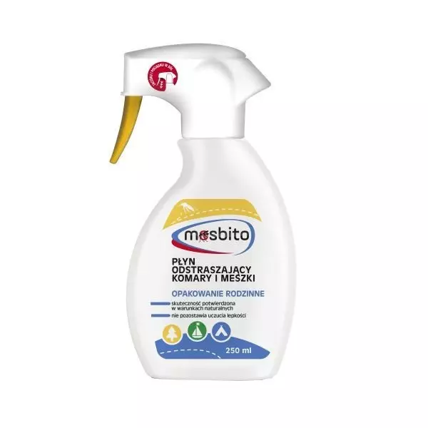 Mosbito płyn odstraszający komary i meszki w atomizerze przeznaczony do bezpośredniego stosowania na skórę. Zawiera naturalny olejek eteryczny, który skutecznie odstrasza owady. Płyn do stosowania dla osób dorosłych i dzieci od 1. roku życia.