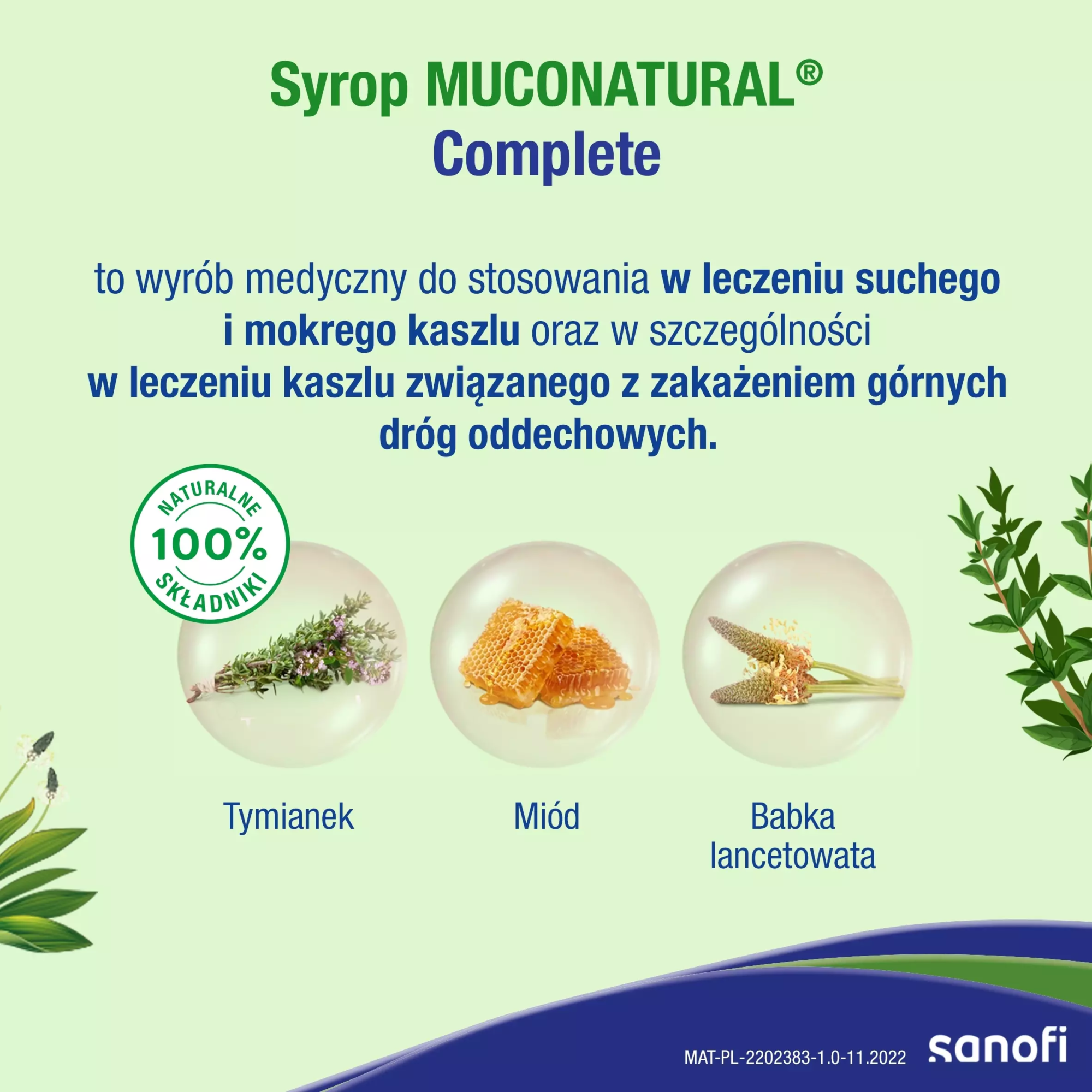 Wyrób medyczny Muconatural Complete, syrop przeznaczony jest dla dorosłych i dzieci powyżej 1. roku życia przy suchym i mokrym kaszlu. Jest szczególnie polecany w leczeniu kaszlu związanego z zakażeniami górnych dróg oddechowych.