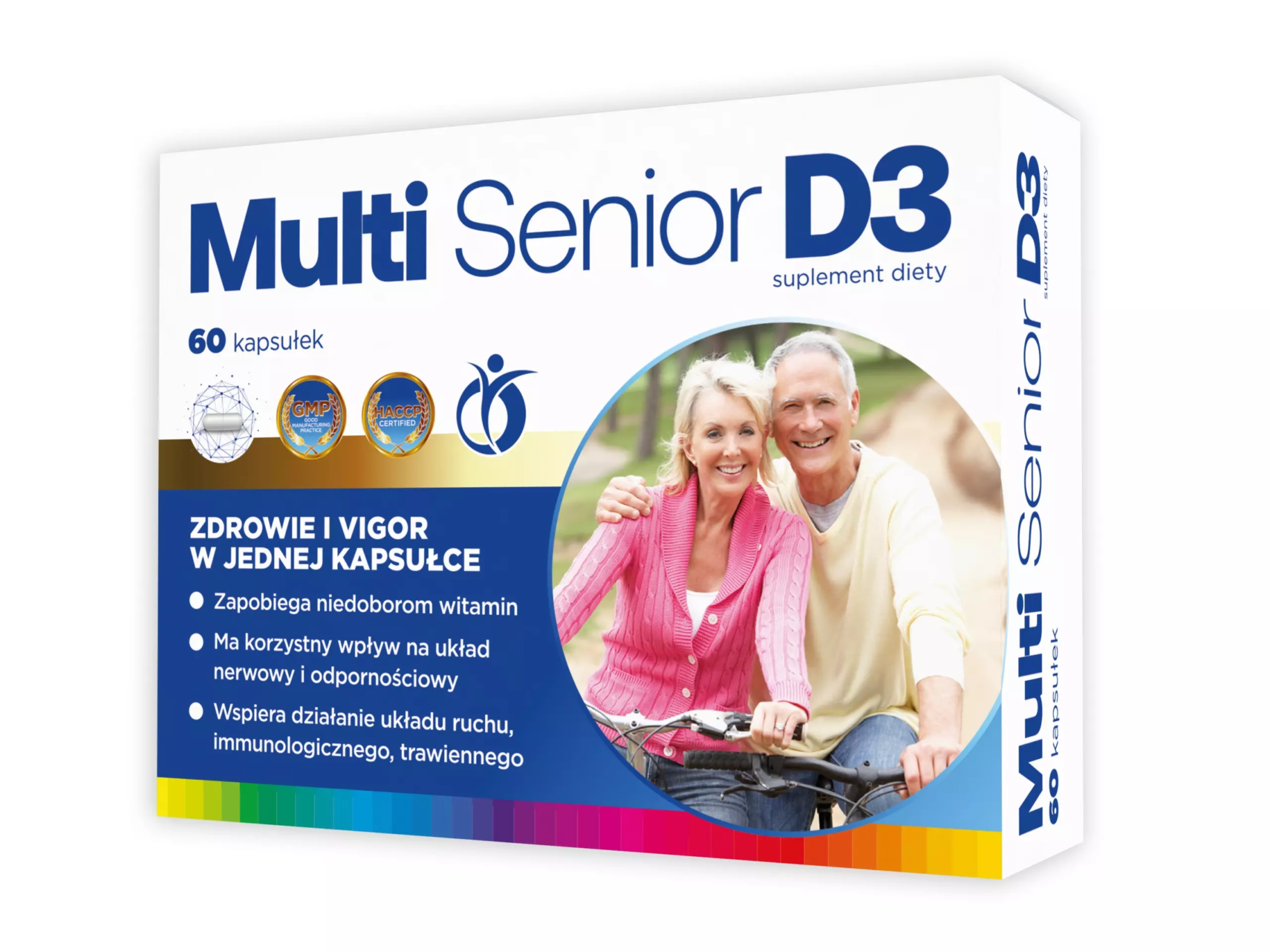 Multi Senior D3 to suplement diety polecany dla osób starszych, który zawiera m.in. witaminę A (wspomaga metabolizm białek i hormonów, pozytywnie wpływa na wzrok i odporność organizmu), witaminę D3 (działanie antynowotworowe, niedobór prowadzi m.in. do otyłości, depresji, na rozwój chorób autoimmunologicznych), witaminę E (silny przeciwutleniacz, „witamina młodości i płodności”), witaminy z grupy B (odpowiedzialne za liczne procesy, w tym dobry nastrój czy sprawność intelektualną, synteza kwasów tłuszczowych i kontrolowanie funkcji mięśni), niacynę (bierze udział w przemianach metabolicznych kwasów tłuszczowych, węglowodanów i aminokwasów, produkcji czerwonych krwinek, obniża poziom cholesterolu, rozszerza naczynia krwionośne), biotynę (wspomaga tarczyce, bierze udział w procesie tworzenia glukozy i syntezie kwasów tłuszczowych) oraz zestaw mikroelementów (niezbędnych do prawidłowego funkcjonowania organizmu).