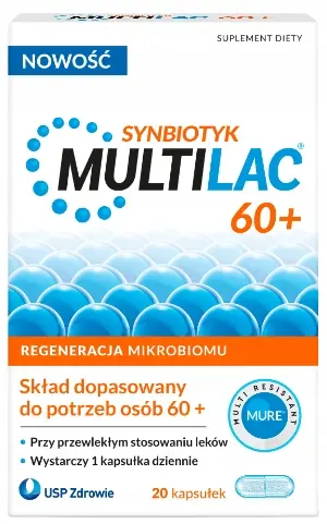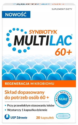 MULTILAC 60+  dzięki zawartości aż 10 miliardów dobroczynnych bakterii  oraz prebiotyku wypełnia ubytki w mikrobiomie i przyspiesza jego odbudowę. Wystarczy stosować jedną kapsułkę dziennie, aby regenerować mikrobiom.