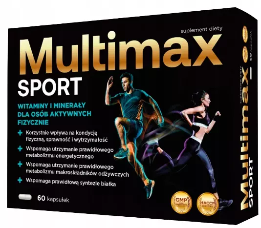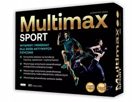 Multimax SPORT to suplement diety polecany dla osób dorosłych, który zawiera m.in. witaminę A (wspomaga metabolizm białek i hormonów, pozytywnie wpływa na wzrok i odporność organizmu), witaminę D3 (działanie antynowotworowe, niedobór prowadzi m.in. do otyłości, depresji, na rozwój chorób autoimmunologicznych), witaminę E (silny przeciwutleniacz, „witamina młodości i płodności”), witaminy z grupy B (odpowiedzialne za liczne procesy, w tym dobry nastrój czy sprawność intelektualną, synteza kwasów tłuszczowych i kontrolowanie funkcji mięśni), niacynę (bierze udział w przemianach metabolicznych kwasów tłuszczowych, węglowodanów i aminokwasów, produkcji czerwonych krwinek, obniża poziom cholesterolu, rozszerza naczynia krwionośne), biotynę (wspomaga tarczyce, bierze udział w procesie tworzenia glukozy i syntezie kwasów tłuszczowych) oraz zestaw mikroelementów (niezbędnych do prawidłowego funkcjonowania organizmu).