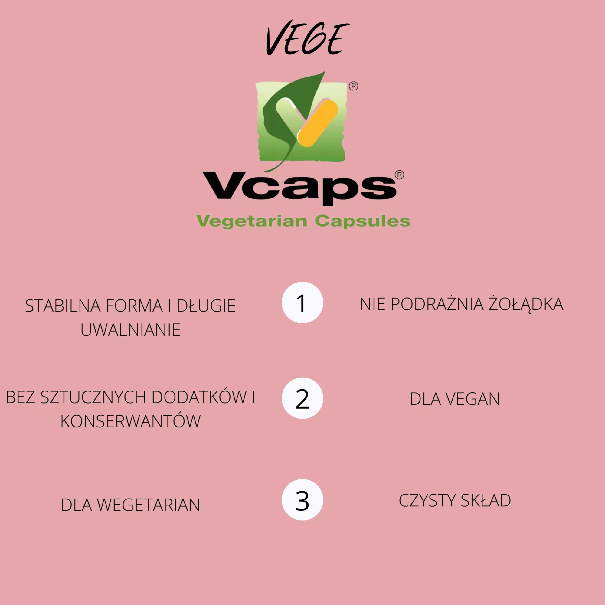 Vcaps® - kapsułki wykonane z hydroksypropylometylocelulozy, pozwalają na kontrolowanym uwalnianiu się substancji aktywnych przez co nie podrażniają żołądka.