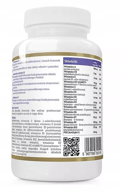 SKŁADNIKI: maltodekstryna, witamina C (kwas L-askorbinowy), niacyna (amid kwasu nikotynowego), witamina E (octan DL-alfa-tokoferylu), kwas pantotenowy (D-pantotenian wapnia), witamina B6 (chlorowodorek pirydoksyny), witamina B2 (ryboflawina), witamina B1 (monoazotan tiaminy), kwas foliowy (kwas pteroilomonoglutaminowy), biotyna (D-biotyna), witamina B12 (metylokobalamina), witamina A (octan retinylu), witamina D3 (cholekalcyferol z lanoliny), witamina K2 vitaMK7® (menachinon-7 Bacillus subtilis natto), kapsułka roślinna Vcaps® (hydroksypropylometyloceluloza - składnik otoczki), FOS (Actilight®)