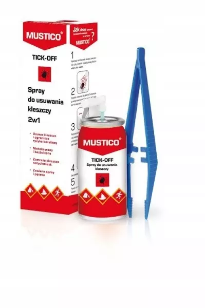 Wyrób medyczny Mustico Tick-Off spray do usuwania kleszczy to nietoksyczny preparat w aerozolu przeznaczony do zamrażania kleszczy wczepionych w skórę człowieka i w ten sposób pozwalający na ich bezpieczne i skuteczne usunięcie.