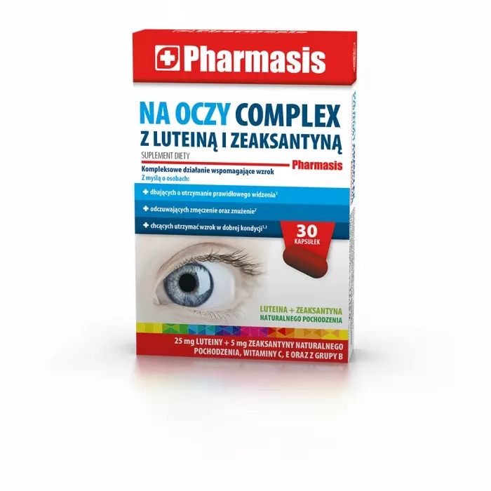 Suplement diety Na Oczy Kompleks z luteiną i zeaksantyną zawiera ekstrakt z kwiatów aksamitki wzniesionej. Dodatkowo produkt został wzbogacony o wysoką ilość witamin z grupy B oraz witaminę C i witaminę E. Został opracowany z myślą o osobach odczuwających zmęczenie i znużenie oraz osobach w starszym wieku.