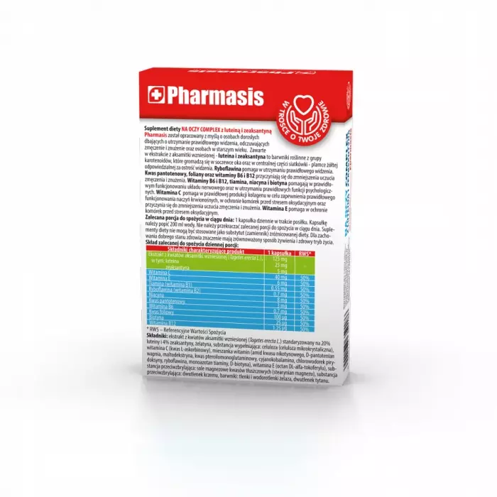 1 kapsułka zawiera: ekstrakt z kwiatów aksamitki wzniesionej (Tagetes erecta) 125mg, w tym: luteina 25mg, zeaksantyna 5mg; witamina C 40mg (50%)*, witamina E 6mg (50%)*, tiamina (witamina B1) 0,55mg (50%)*, ryboflawina (witamina B2) 0,7mg (50%)*, niacyna 8mg (50%)*, kwas pantotenowy 3mg (50%)*, witamina B6 0,7mg (50%)*, kwas foliowy 100mcg (50%)*, biotyna 25mcg (50%)*, witamina B12 1,25mcg (50%)*
