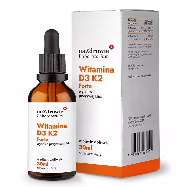 NaZdrowie laboratorium K2 D3 Forte to połączenie dwóch wysokiej klasy, naturalnie pozyskanych witamin, w maksymalnych, dopuszczalnych prawem porcjach. Bazą jest oliwa z oliwek, która nie jełczeje i stanowi dobry nośnik dla skutecznej suplementacji witamin rozpuszczalnych w tłuszczach.