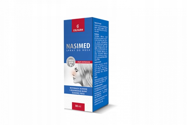 Wyrób medyczny Nasimed to spray wspomagający ochronę i regenerację błony śluzowej nosa Specjalnie dobrany skład przyspiesza procesy regeneracyjne śluzówki oraz ogranicza rozwój drobnoustrojów chorobotwórczych. Zawartość nanocząsteczek srebra oraz olekju eukaliptusowego ułatwia oczyszczanie jamy nosowej. Dodatek gliceryny nawilża wysuszoną śluzówkę nosa, wspomagając tworzenie na jej powierzchni ochronnego filmu.