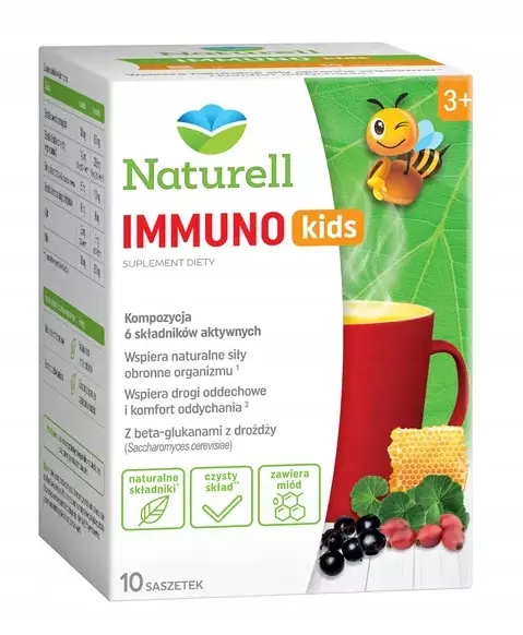 Naturell Immuno Kids to suplement diety w postaci proszku do rozpuszczania w wodzie, przeznaczony dla dzieci powyżej trzeciego roku życia. Witamina C oraz cynk, zawarte w suplemencie, mają wpływ na prawidłowe funkcjonowanie układu odpornościowego. Pelargonia afrykańska i czarny bez poprawiają kondycję układu oddechowego. Suplement diety Naturell Immuno Kids dostarcza młodemu organizmowi dzienną dawkę aż sześciu składników aktywnych, dzięki czemu odporność dziecka znacznie się podwyższa.