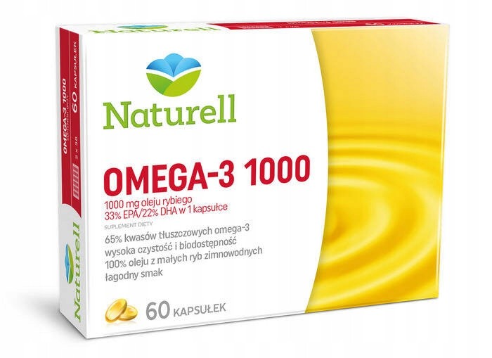Naturell Omega-3 1000 suplement diety zawiera wysokogatunkowy i skoncentrowany olej z małych ryb zimnowodnych, o wysokiej zawartości kwasów tłuszczowych omega-3. Preparat standaryzowany jest na zawartość minimum 65% kwasów EPA i DHA. Kwasy omega-3 w Naturell Omega-3 1000 mają postać triglicerydów, czyli taką, jaka naturalnie występuje w rybach. Dzięki temu mogą być lepiej przyswajane przez organizm człowieka.