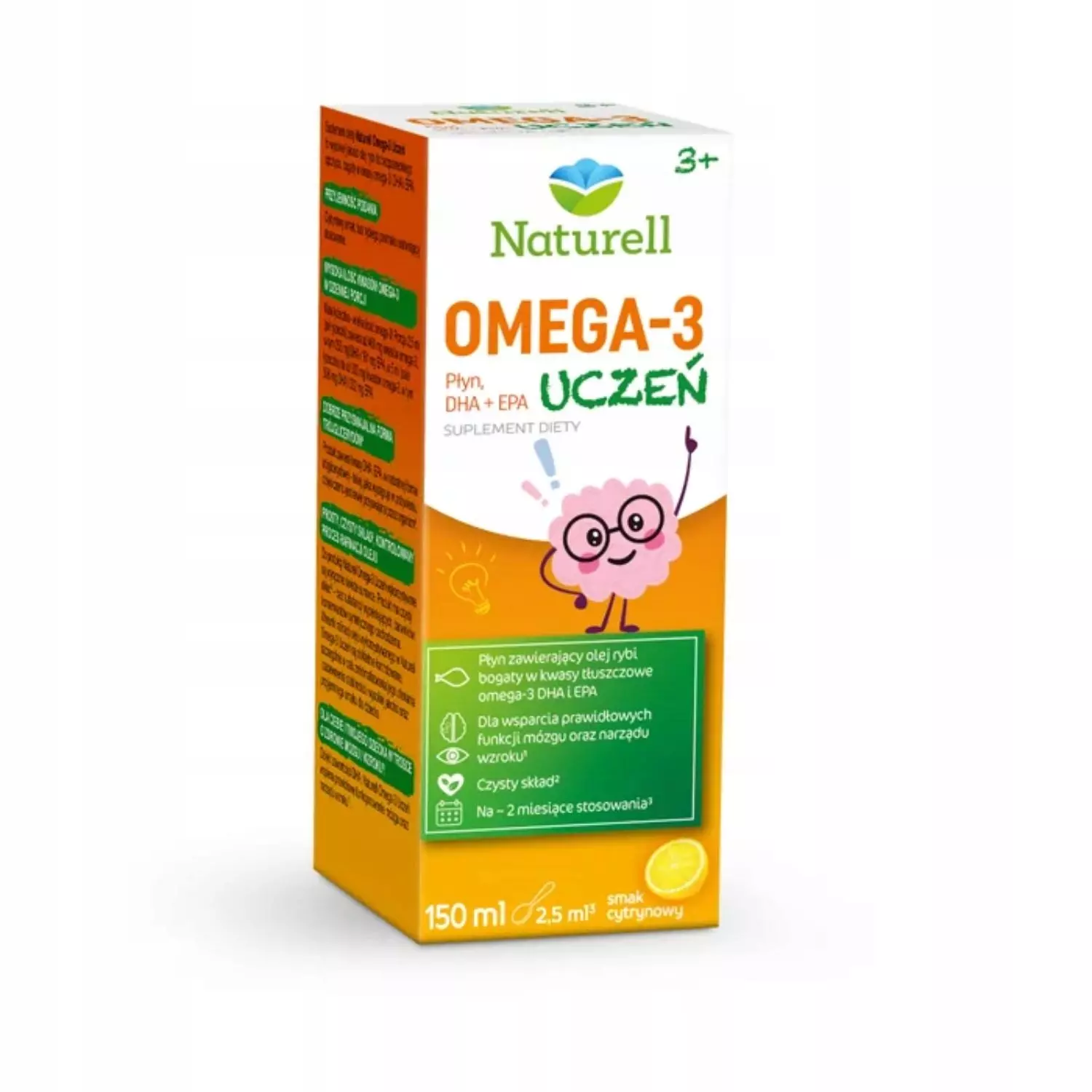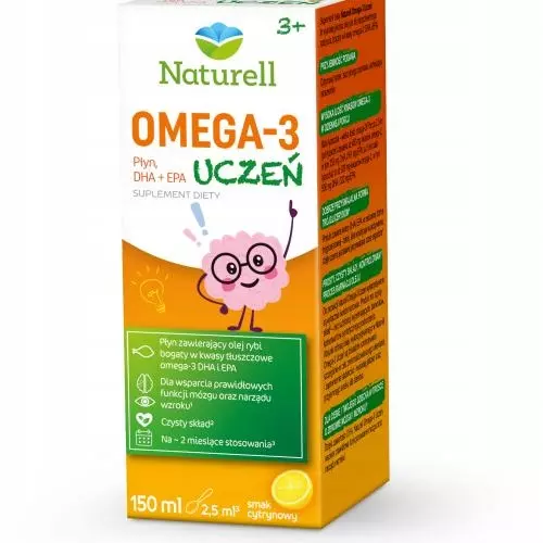 - Suplement diety Naturell Omega-3 Uczeń to wysokiej jakości olej rybi do bezpośredniego spożycia o pysznym cytrynowym smaku, bogaty w kwasy omega-3: DHA i EPA, przeznaczony dla dzieci już od 3 roku życia.
