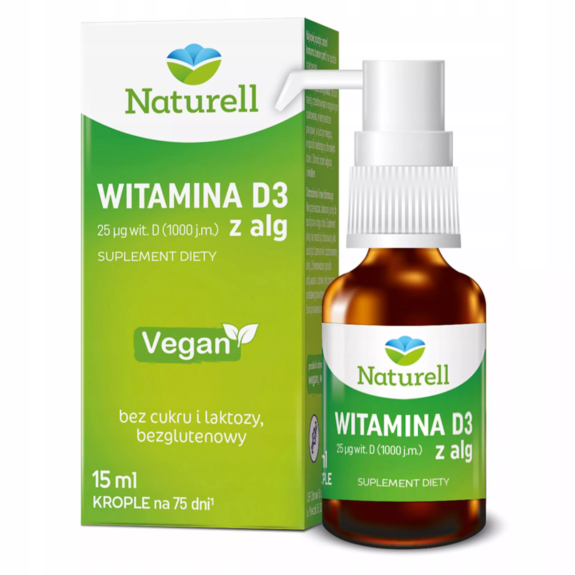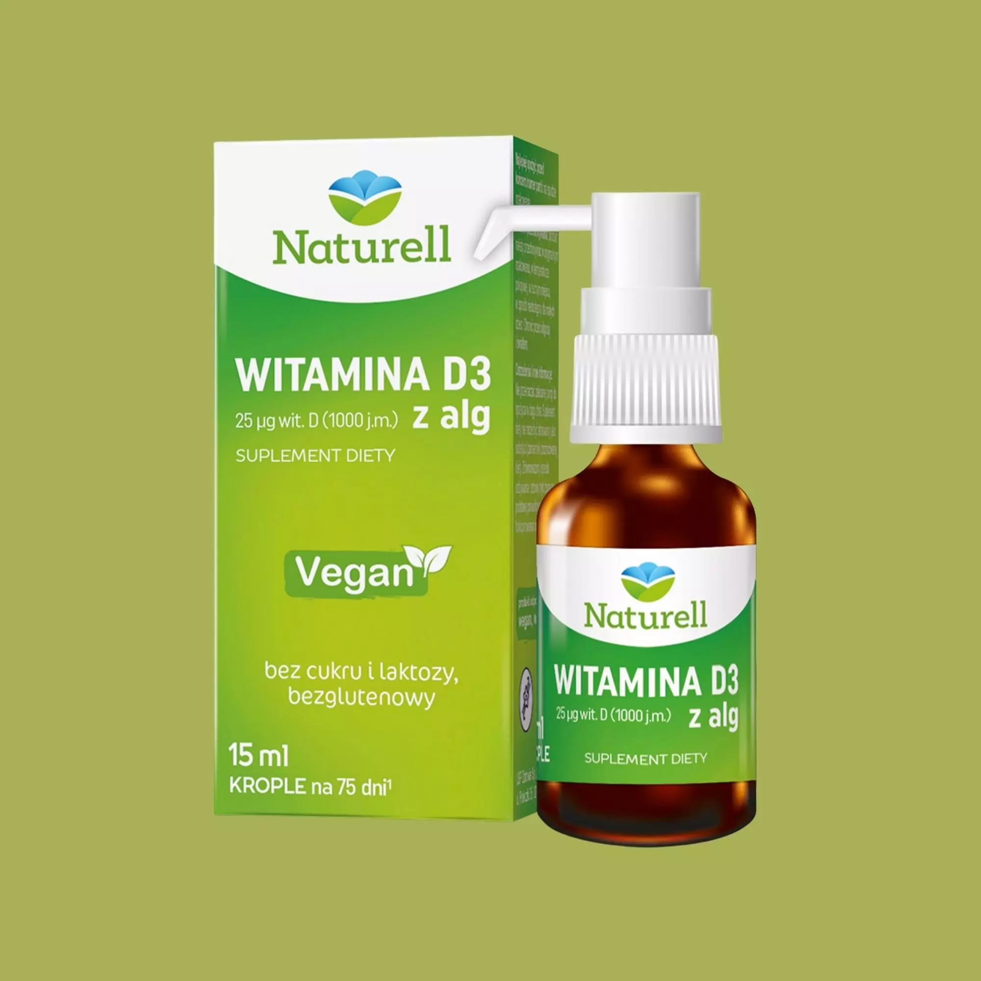 Naturell Witamina D3 z alg to suplement diety, którego składniki wspomagają prawidłowy poziom witaminy D3 w organizmie. Produkt przeznaczony dla dzieci powyżej 3. roku życia i dorosłych.