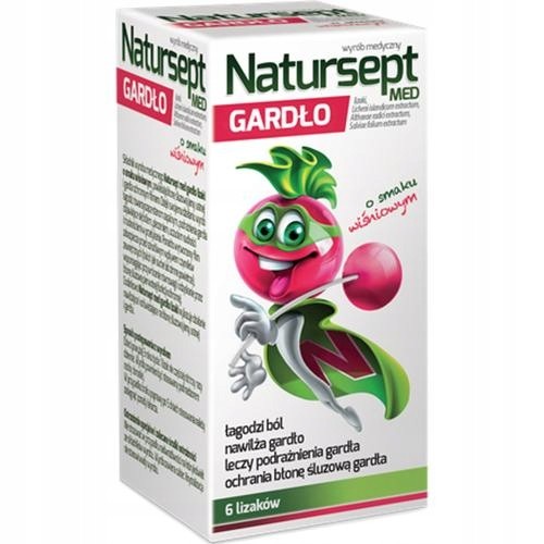 NATURSEPT MED GARDŁO lizaki o smaku wiśniowym powlekają błonę śluzową gardła ochronnym filmem. Dzięki składnikom aktywnym leczą podrażnienia, łagodzą ból i nawilżają gardło.