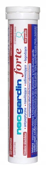 Neogardin Forte 20 tabletki do ssania na gardło na bazie naturalnych składników: miodu, szałwii, eukaliptusa, prawoślazu i witaminy C (citrus medica). Skład wzbogacono o biotynę, laktoferynę i ksylitol.