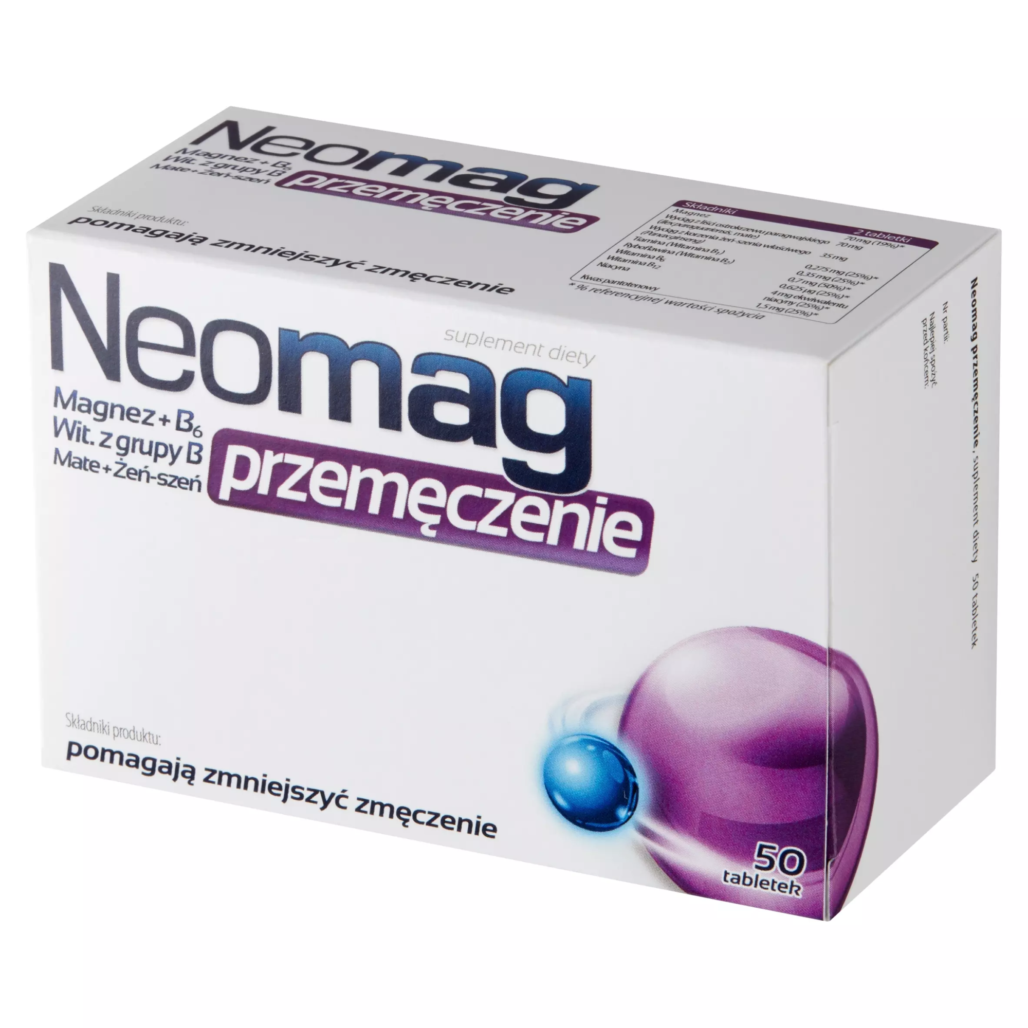 Składniki suplementu diety NeoMag przemęczenie przyczyniają się do: - zmniejszenia uczucia zmęczenia i znużenia, - utrzymania prawidłowego metabolizmu energetycznego, - zwiększenia wytrzymałości na fizyczne i psychiczne zmęczenie, dzięki właściwościom stymulującym i tonizującym, oraz pomagają w: - prawidłowym funkcjonowaniu układu nerwowego i utrzymaniu prawidłowych funkcji psychologicznych, - utrzymaniu sprawności intelektualnej i fizycznej w przypadkach osłabienia, wyczerpania, zmęczenia i obniżenia koncentracji. Magnez przyczynia się do zmniejszenia uczucia zmęczenia i znużenia oraz do utrzymania prawidłowego metabolizmu energetycznego.