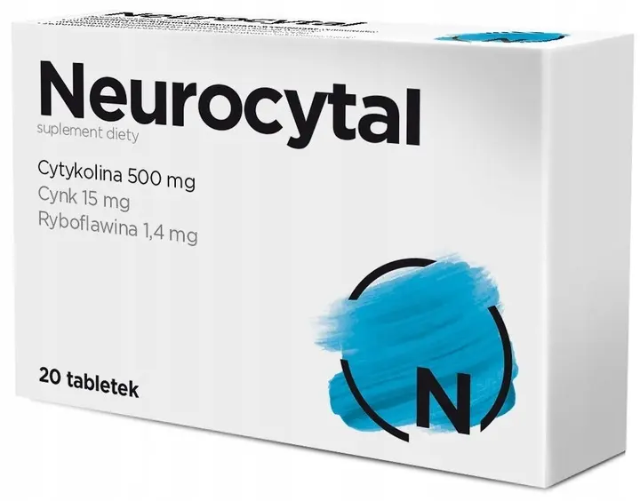 Neurocytal to suplement diety zawierający 500 mg cytykoliny, 15 mg cynku (150% referencyjnej wartości spożycia) oraz 1,4 mg witaminy B2 (ryboflawiny, 100% RWS) w jednej tabletce. citeturn0search6 Właściwości składników Cytykolina po spożyciu rozkłada się na cholinę i cytydynę, które uczestniczą w różnych szlakach metabolicznych w organizmie, w tym w mózgu. Witamina B2 (ryboflawina) pomaga w prawidłowym funkcjonowaniu układu nerwowego, utrzymaniu prawidłowego widzenia oraz ochronie komórek przed stresem oksydacyjnym. Cynk wspiera utrzymanie prawidłowych funkcji poznawczych, prawidłowego widzenia oraz ochronę komórek przed stresem oksydacyjnym. Zalecane spożycie Dorośli powinni przyjmować 1 tabletkę dziennie, w trakcie lub po posiłku, popijając wodą. Przeciwwskazania i uwagi Nie stosować w przypadku nadwrażliwości na którykolwiek ze składników produktu. W okresie ciąży i karmienia piersią przed zastosowaniem należy skonsultować się z lekarzem. Nie zaleca się stosowania preparatu łącznie z lekami zawierającymi centrofenoksynę (meklofenoksat) oraz lewodopę (L-Dopa). Suplement diety nie może być stosowany jako substytut zróżnicowanej diety.