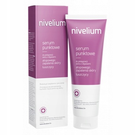 Serum punktowe Nivelium to preparat do punktowego stosowania w miejscach, szczególnie charakteryzujących się dokuczliwymi objawami: redukuje swędzenie i pieczenie, zmniejsza zaczerwienienie, suchość i łuszczenie się skóry. Skoncentrowana formuła bezbarwnego żelu tworzy satynowy ochronny film pielęgnujący, nie pozostawiając wrażenie tłustej i lepkiej skóry.