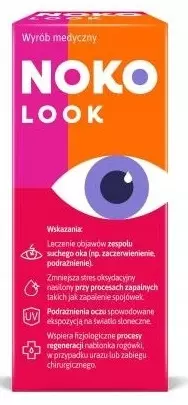 Noko Look krople do oczu to kojący, nawilżający i fotoprotekcyjny wyrób medyczny na bazie usieciowanej karboksymetylocelulozy i protein jedwabiu. Dzięki synergii swoich składników krople na podrażnione oczy Noko Look zapewniają większą stabilność filmu łzowego oraz chronią oko przed ekspozycją na promieniowanie UV (250-300nm) i przed stresem oksydacyjnym. Ponadto wyrób medyczny tworzy barierę ochronną na powierzchni oka, która sprzyja fizjologicznym procesom gojenia nabłonka rogówki. Krople na suchość oczu mogą być stosowane również u dzieci.