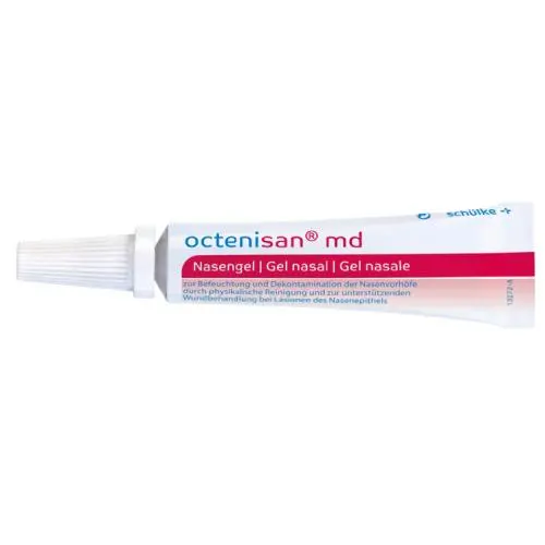 wyrób medyczny Octenisan md żel do nosa jest hydrożelem do nawilżania i dekontaminacji przedsionków nosa poprzez czyszczenie fizyczne i do wspomagania leczenia ran w przypadku uszkodzeń nabłonka nosa.