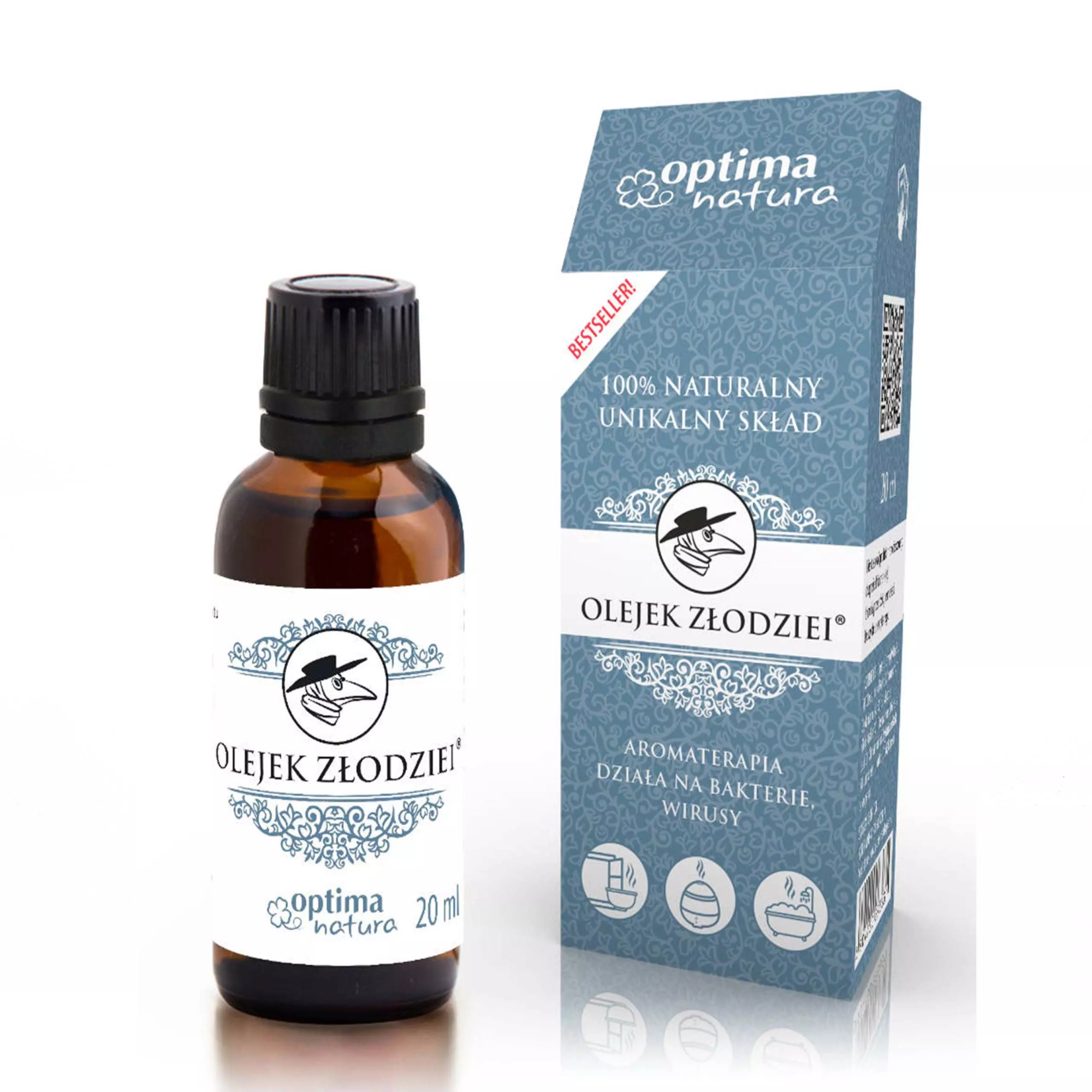 Unikalna mieszanka 100% naturalnych olejków eterycznych. Naturalny Olejek Złodziei ® to wyjątkowa kompozycja 6 wysokiej jakości olejków. Ma bardzo przyjemny i odświeżający zapach, nie lubią go jednak bakterie, roztocza i owady. Idealnie przyczyni się do poprawy mikroklimatu pomieszczeń, z których chcemy pozbyć się patogenów, świetnie sprawdzi się w antybakteryjnej kąpieli, czy też w masażu aromaterapeutycznym.