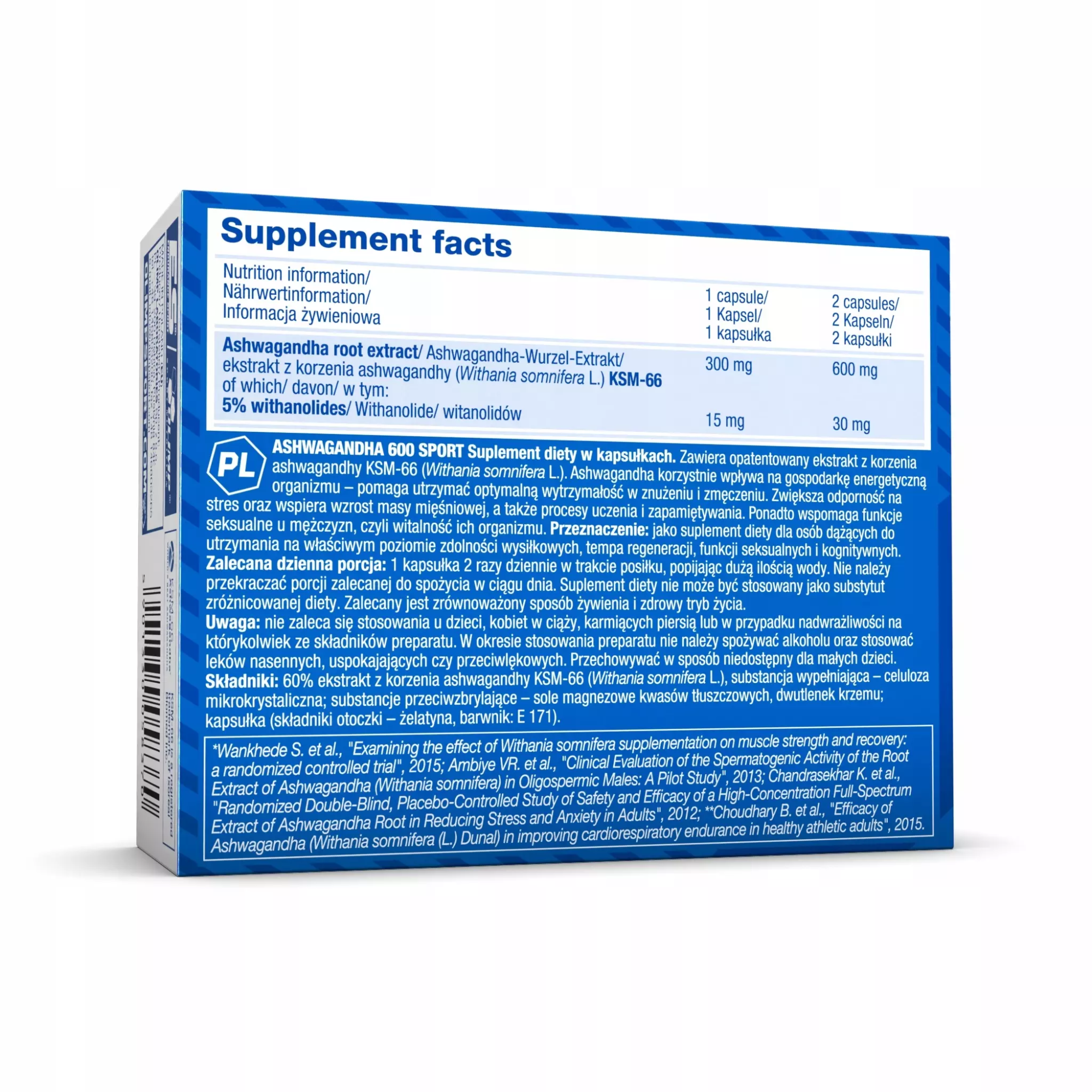 Ashwagandha 600 Sport to suplement diety w kapsułkach od polskiego producenta Olimp Sport Nutrition. W opakowaniu znajduje się 60 kapsułek, czyli sześćdziesiąt pełnych porcji przy zalecanym przez producenta sposobie spożycia 1kaps/porcja. Ashwagandha Sport 60 capsules zawiera w swoim składzie ekstrakt z ashwagandhy (cała roślina)(withania somnifera), nazywana też indyjskim żeń-szeniem - roślina zaliczana do adaptogenów, które wspomagają odporność organizmu. Aswagandha wykorzystywana jest w medycynie indyjskiej od ponad 2 tysięcy lat w stanach zmęczenia, wyczerpania oraz dużego napięcia psychicznego.