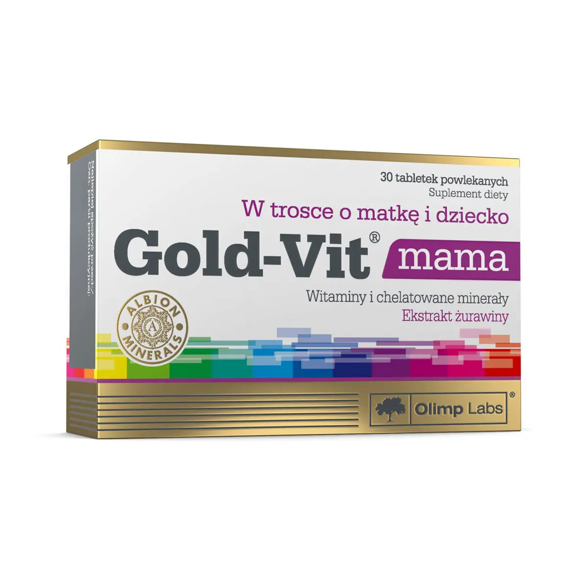 Gold-Vit mama to suplement diety, który zawiera kompozycję witamin i składników mineralnych, w formie wysoko przyswajalnych chelatów aminokwasowych Albion, uzupełniająca zwiększone zapotrzebowanie na mikroskładniki odżywcze dla kobiet w okresie ciąży i laktacji. Formuła uzupełniona została o ekstrakt żurawiny wielkoowocowej (Vaccinum macrocarpon Ait.) oraz żelazo Ferrochel i kwas foliowy w odpowiedniej dawce dla kobiet w ciąży.
