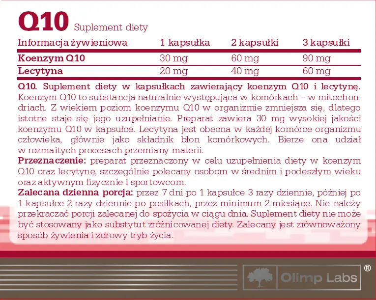 Olimp Koenzym Q10 to suplement przeznaczony w celu uzupełnienia diety w koenzym Q10 oraz lecytynę, szczególnie polecany osobom w średnim i podeszłym wieku oraz aktywnym fizycznie i sportowcom.