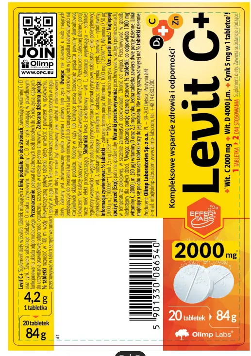 Opis Olimp Levit C+ – suplement diety w postaci tabletek musujących zawierający witaminy C i D oraz cynk. Wspiera układ odpornościowy. Produkt przeznaczony dla osób dorosłych do 75. roku życia. Smak cytrynowy. Witamina C – wspiera układ immunologiczny, ochronę komórek przed stresem oksydacyjnym oraz funkcjonowanie układu nerwowego. Wpływa na zmniejszenia uczucia znużenia i zmęczenia. Cynk – wspomaga odporność, podział komórek i proces produkcji białka potrzebnego do zwalczania drobnoustrojów. Składniki Kwas L-askorbinowy – wit. C, substancja wypełniająca – sorbitole; regulatory kwasowości – węglany sodu, kwas cytrynowy; naturalny aromat cytrynowy, stabilizator – glikol polietylenowy; cholekalcyferol – wit. D, substancje słodzące – acesulfam K, sukraloza; tlenek cynku – cynk, barwnik – ryboflawiny. Składnik 1/2 tabletki %RWS Witamina C 1000 mg 1250% Witamina D 50 µg (2000 j.m.) 1000% Cynk 2,5 mg 25% *Referencyjna Wartość Spożycia Dawkowanie Dorośli do 75. roku życia: ½ tabletki rozpuścić w 100 ml wody. Niewykorzystaną połowę tabletki należy umieścić z powrotem w opakowaniu, przechowywać w takich samych warunkach i spożyć w ciągu 24 h. Przeciwwskazania Nie stosować u osób mających predyspozycje do tworzenia kamieni nerkowych lub chorujących na kamicę nerkową. Kobiety w ciąży lub karmiące piersią stosowanie preparatu powinny skonsultować z lekarzem. Nie należy spożywać innych preparatów zawierających witaminę C i D. Przekroczenie zalecanej dziennej porcji może mieć efekt przeczyszczający. Nie stosować w przypadku nadwrażliwości na którykolwiek ze składników preparatu. Nie należy przekraczać zalecanej porcji do spożycia w ciągu dnia. Preparat jest suplementem diety, nie może być stosowany jako substytut (zamiennik) zróżnicowanej diety. Zalecany jest zrównoważony sposób żywienia i zdrowy tryb życia. Przechowywanie Przechowywać w suchym miejscu. Chronić od światła i wilgoci. Przechowywać w temperaturze pokojowej, w sposób niedostępny dla małych dzieci. Po użyciu opakowanie należy zawsze zamykać.