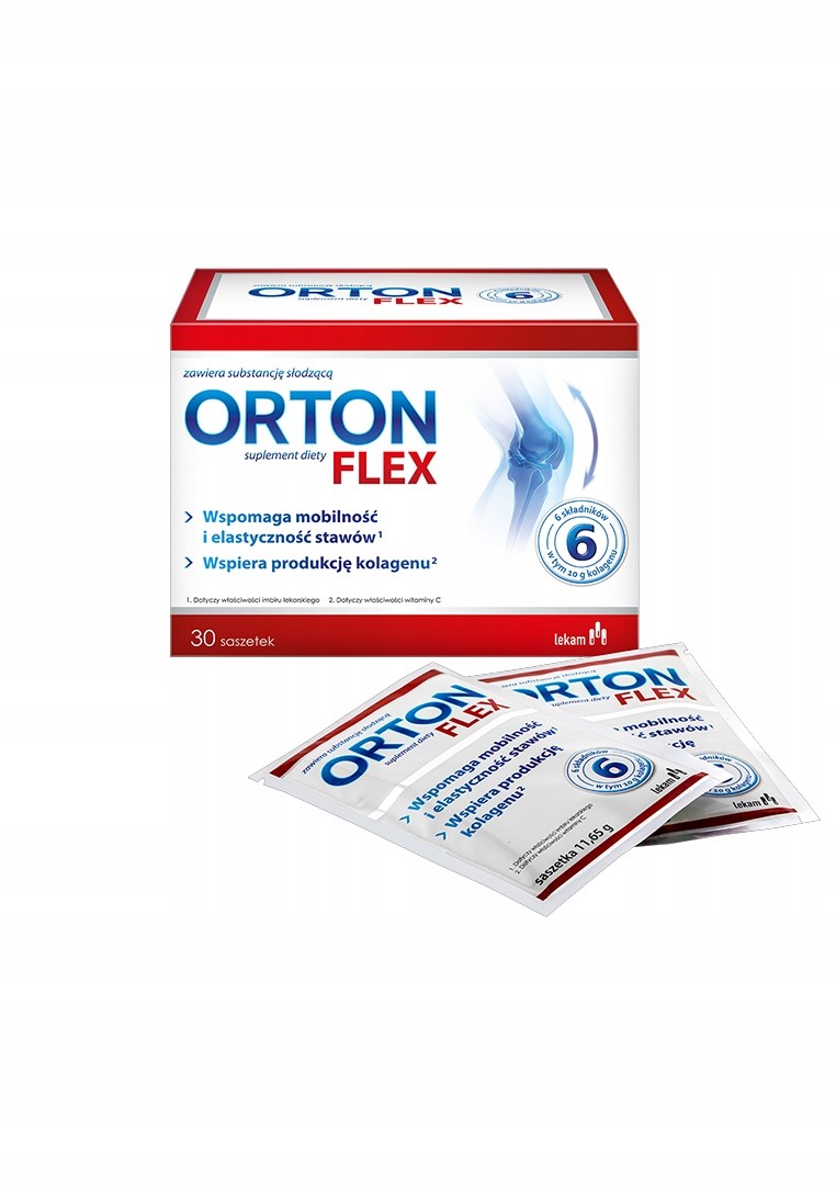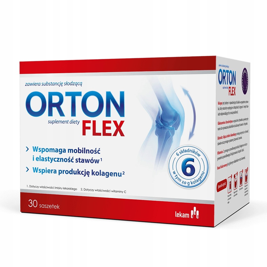 Orton Flex to preparat specjalnie opracowany z myślą o osobach, które chcą kompleksowo zadbać o swoje stawy. Dzięki unikalnej kompozycji aż 6 składników zawierającej: kolagen, glukozaminę, chondroitynę, ekstrakt z kłącza imbiru lekarskiego, witamina C oraz kwas hialuronowy, Orton Flex saszetki kompleksowo wspomaga prawidłowe funkcjonowanie stawów. Rozpuszczalna forma preparatu w postaci saszetek, pozwala na szybkie przyswojenie wysokich dawek wyselekcjonowanych składników.