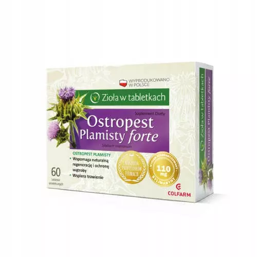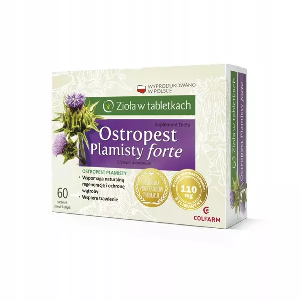 Suplement diety Ostropest Plamisty Forte zawiera wysoką dawkę wyciągu z nasion ostropestu, w tym 110 mg sylimaryny w jednej tabletce. Suplement został stworzony z myślą o osobach dbających o funkcjonowanie wątroby oraz dróg żółciowych. Opakowanie zawiera 60 tabletek z preparatem.