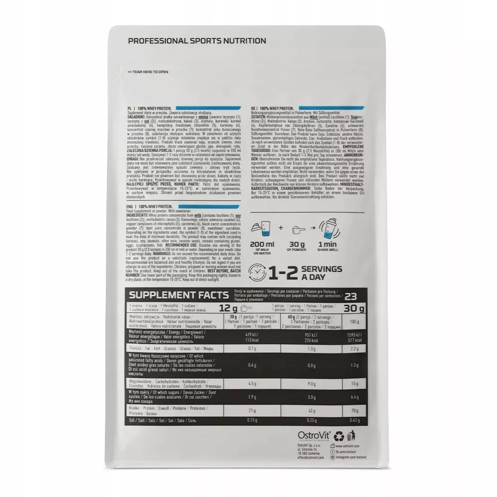 OstroVit 100% Whey Protein to suplement diety, który stanowi źródło koncentratu białka serwatki, zawierającego aż 70% wysokiej jakości protein. To preparat, który dostarcza do organizmu aminokwasy rozgałęzione BCAA, a także niezbędne aminokwasy egzogenne EAA. To niskotłuszczowy produkt, dostępny w postaci proszku w różnych wariantach smakowych, który został stworzony z myślą o sportowcach i osobach, którym zależy na uzupełnieniu codziennej diety w cenny makroskładnik.