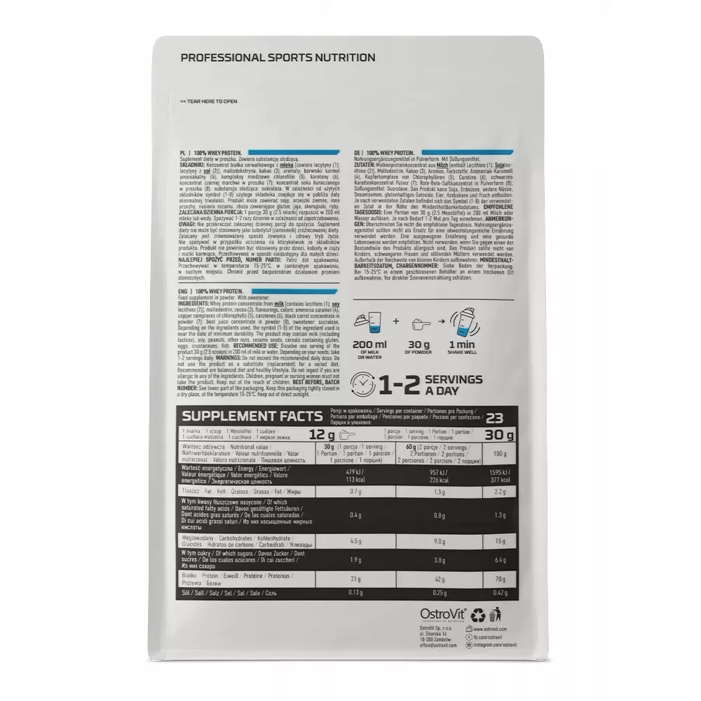 OstroVit 100% Whey Protein to suplement diety, który stanowi źródło koncentratu białka serwatki, zawierającego aż 70% wysokiej jakości protein. To preparat, który dostarcza do organizmu aminokwasy rozgałęzione BCAA, a także niezbędne aminokwasy egzogenne EAA. To niskotłuszczowy produkt, dostępny w postaci proszku w różnych wariantach smakowych, który został stworzony z myślą o sportowcach i osobach, którym zależy na uzupełnieniu codziennej diety w cenny makroskładnik.