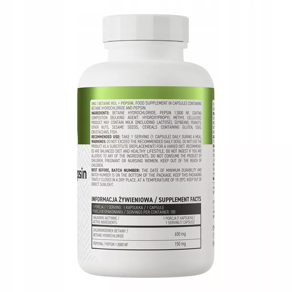 Źródło betainy HCl oraz pepsyny - jedna porcja suplementu diety dostarcza do organizmu 650 mg chlorowodorku betainy oraz 150 mg pepsyny.